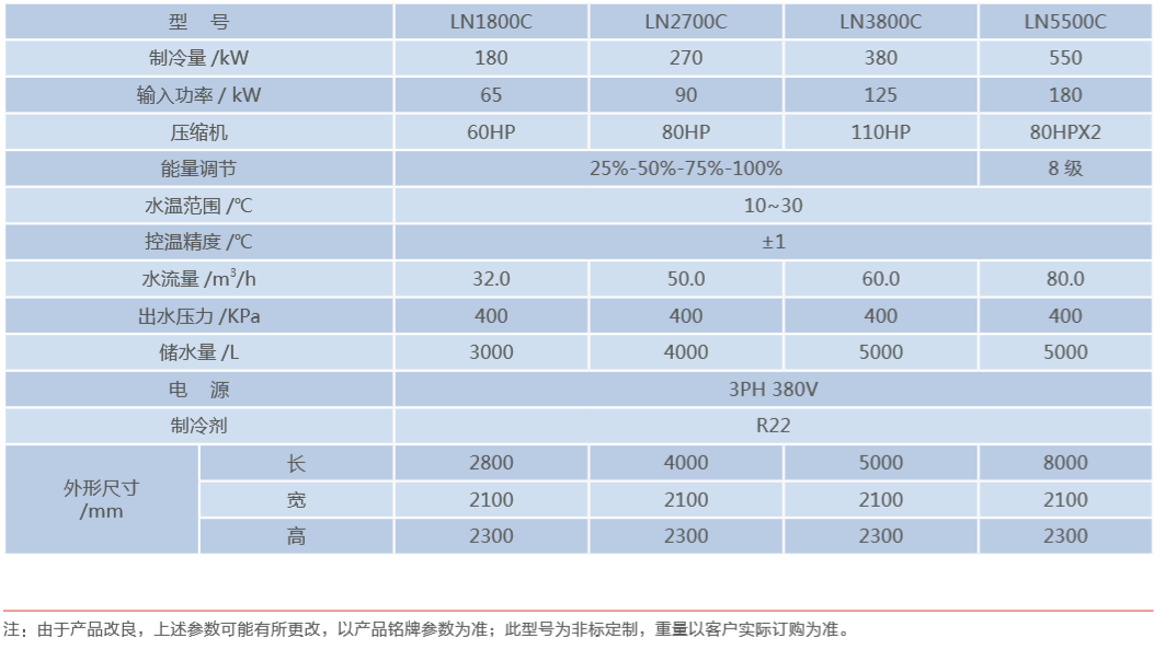 根據(jù)用戶要求的制冷量而定制,制冷主機(jī)采用效率更高的螺桿式制冷壓縮機(jī),視功率大小室外機(jī)或?yàn)閱闻_和多臺分別控制運(yùn)行。配 7 寸 PLC 彩色 液晶觸摸屏,功能強(qiáng)大,結(jié)構(gòu)緊湊。選配高效低噪聲風(fēng)機(jī)。制冷系統(tǒng)加配經(jīng)濟(jì)器和噴液裝置,在提高增提性能的同時(shí),保證壓縮機(jī)在環(huán)境溫度下更 可靠的運(yùn)行。水箱、水泵現(xiàn)場布置。